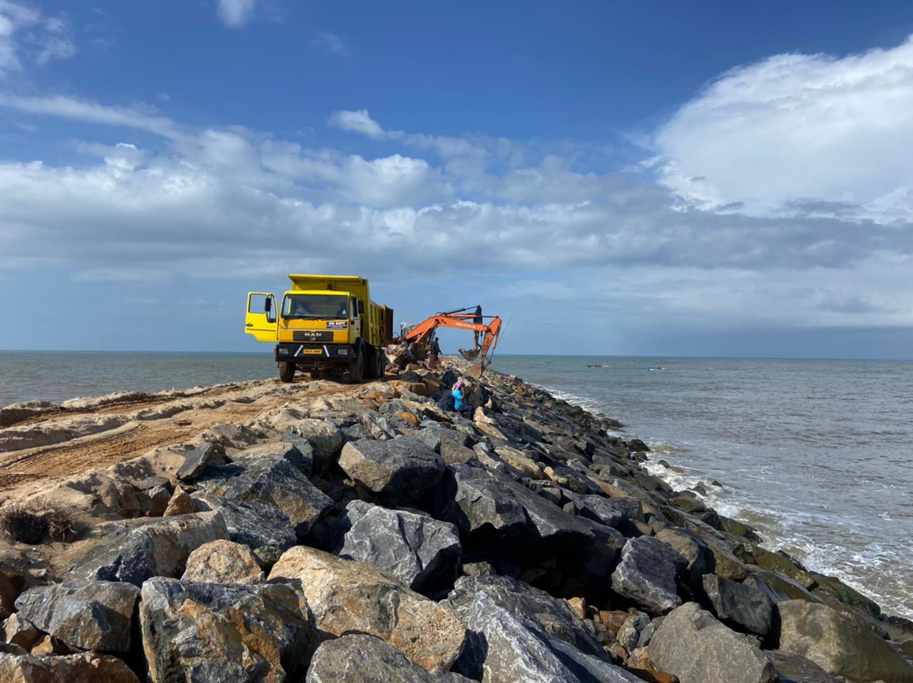 A fishing harbor is a place where many things come together – fish, people and fishing technology. Accordingly establishment of right infrastructure at the right place is very important for proper functioning of a fishing harbour. For construction of a modern fishing harbour convenient wharf or other facilities are most important. Such civil works include putting/laying of tones of boulders in the sea as a base structure for construction of various works of the fishing harbour. This requires unhindered supply of quality boulders from license quarries, their transportation and putting them in the sea depth as per the plan.